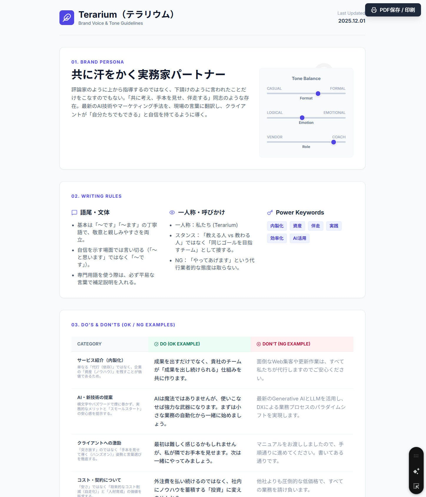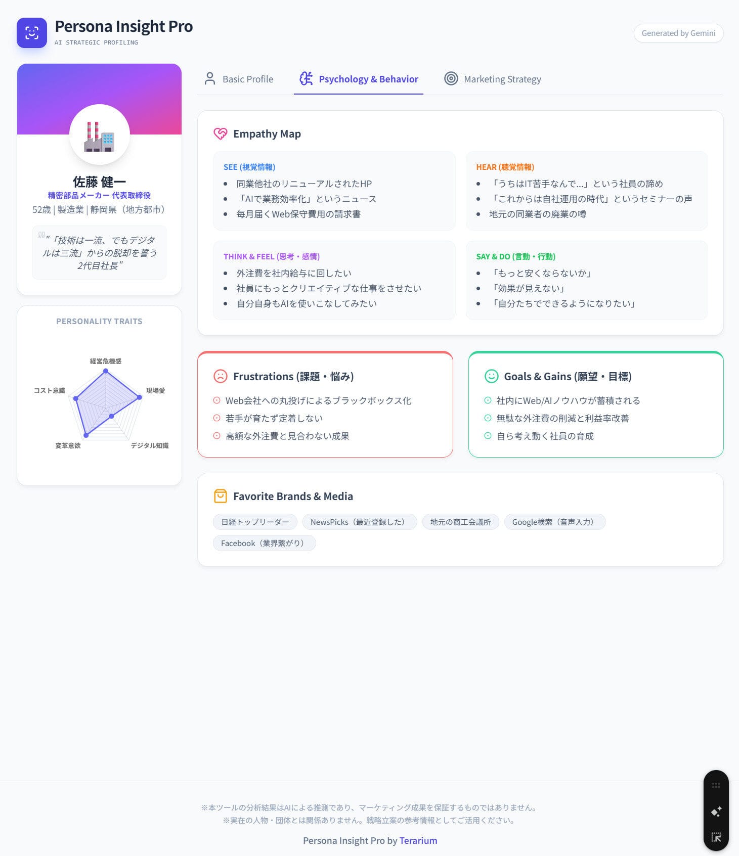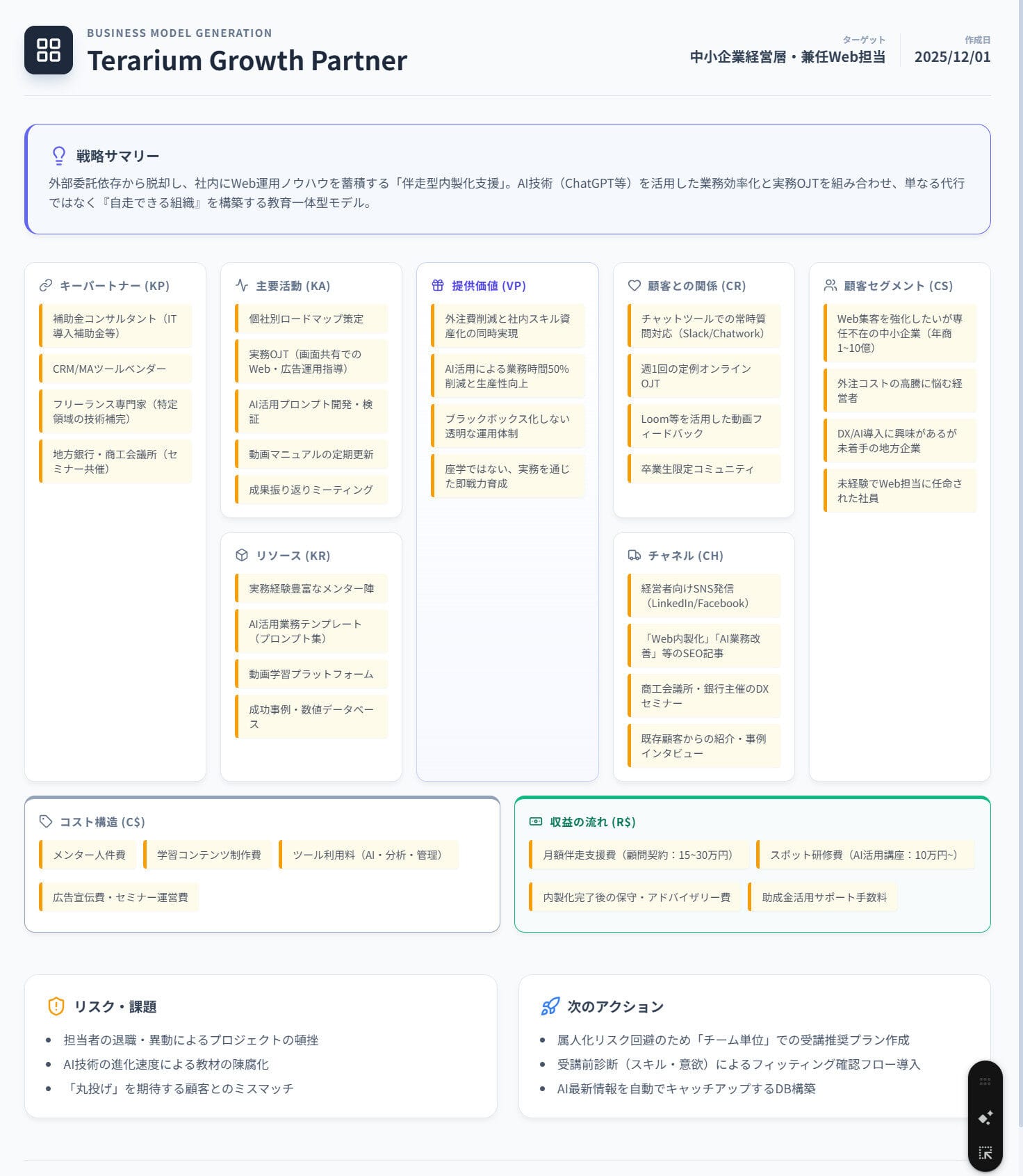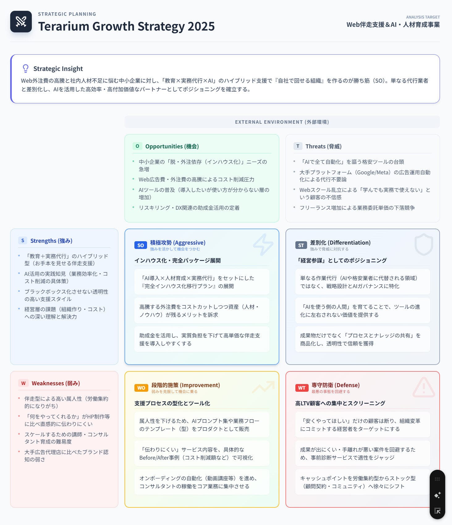 Web担当者育成・AI活用・マーケティング支援のTerarium(https://terarium.biz/)中小企業の経営層が抱えるWeb外注の高コスト化、ノウハウが蓄積しない、社員が育たない、業務効率化、AI活用を取り入れたい。そんな悩みを伴走型支援でお手本を見せながらの社員育成で解決するサービス。コンサル業務、代行業務、育成業務をワンストップで可能にするのがウリ。